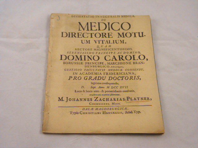 MEDIZIN.– PLATNER, Johann Zacharias: De Medico Directore Motuum Vitalium Dissertaio Inauguralis medica. Halle (Henckel), 1717. 36 S. mit figürlich gestochenen Anfangsvignetten. ungeheftet. etwas gelockert, etwas eng beschnitten, aber ohne jeden Textverlust. Hier die EA und nicht der wohlfeile Reprint. Seltene Dissertation des berühmten Leipzigers: Johann Zacharias Platner (* 16. August 1694 in Chemnitz; † 19. Dezember 1747 in Leipzig) war ein deutscher Mediziner. Der Sohn des Chemnitzer Kaufmanns und Bürgermeisters Dr. med. Zacharias Platner (* 13. Dezember 1658 in Chemnitz; † 29. November 1729 ebenda) und dessen Frau Anna Magdalena Schnorr von Carolsfeld (* 24. September 1674 in Chemnitz; † 22. November 1731 in Chemnitz) sollte anfänglich den Beruf des Vaters ergreifen. Er besuchte ab 1704 die Stadtschule seiner Heimatstadt und bezog 1712 die Universität Leipzig. Hier wollte er sich den medizinischen Wissenschaften widmen. Nach den universitären Sitten jener Zeit absolvierte er anfänglich ein Studium der Philosophie. Nebenher besuchte er die Vorlesungen von August Quirinus Rivinus und anderen medizinischen Dozenten. Er wechselte 1715 an die Universität Halle, um die damals bekannten Vorträge Georg Ernst Stahls zu hören. Hier lernte er Christian Thomasius kennen und promovierte am 25. September 1716 zum Doktor der Medizin. Zurückgekehrt nach Leipzig, erwarb er im Februar 1717 den akademischen Grad eines Magisters der Philosophie. Im Anschluss unternahm er eine wissenschaftliche Reise, die ihn durch Deutschland, an die Universität Paris und an die Universität Leiden führte. In Leiden war er ein Schüler von Herman Boerhaave und Bernhard Friedrich Albinus und in Paris von John Thomas Woolhouse (1666–1734), bei dem er sich vor allem mit der Augenheilkunde beschäftigte. Über Chemnitz gelangte er 1720 wieder nach Leipzig, wurde dort 1721 außerordentlicher Professor der Anatomie und Chirurgie, 1724 ordentlicher Professor der Physiologie, 1737 Professor der Pathologie und 1747 Professor der Therapie. Mit der letzten Berufung war er auch Medizinalrat am Hof des Kurfürsten geworden. Jedoch verweilte er nicht lange in dieser Position, da er noch im selben Jahr starb. Platner hatte sich auch an den organisatorischen Aufgaben der Leipziger Hochschule beteiligt, war Dekan der medizinischen Fakultät gewesen und war im Wintersemester 1727 Rektor der Alma Mater. (Wikipedia)