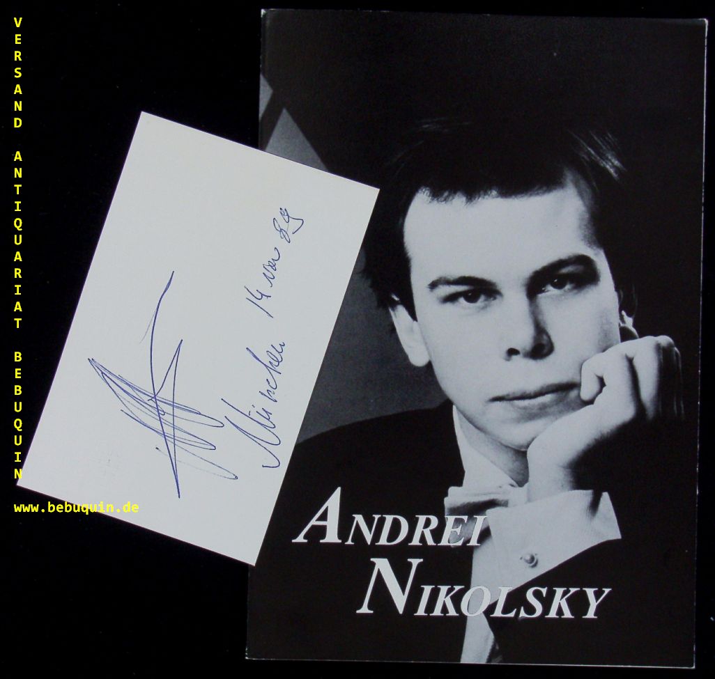 NIKOLSKI, Andrei (Pianist): eigenhändig signierte und datierte Autogrammkarte. München (Herkulessaal), 14.11.1989. 8 x 12,5 cm. Karteikarte in aufwendiger Autogrammmappe. Andrei Wladimirowitsch Nikolski (* 1959 in Moskau; † 3. Februar 1995 bei Waterloo, Belgien) war ein russischer Pianist. (Wikipedia)