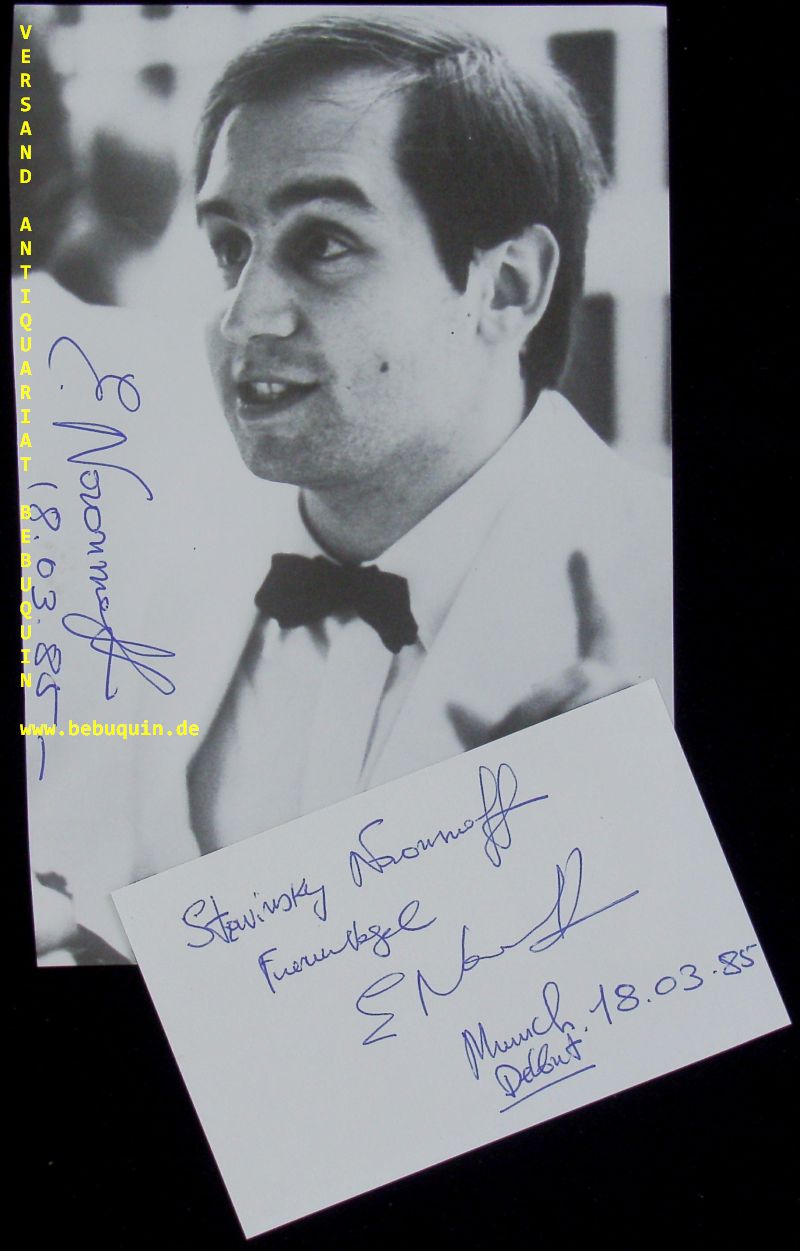 NAOUMOFF, Emile (Pianist): eigenhändig signierte und datierte Autogrammkarte + eigenhändig signierte und datierte Portraitseite. München (Philharmonie), 18.3.1985. 8 x 12,5 + 21 x 17,5 cm. 2 Bl. Émile Naoumoff (born 20 February 1962 in Sofia, Bulgaria) is a Bulgarian pianist and composer. (Wikipedia)