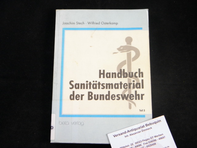MEDIZIN.– STECH, Joachim + OSTERKAMP, Wilfried: Handbuch Sanitätsmaterial der Bundeswehr. Teil 3. Bonn (Beta), 1998. 334 S. mit zahlr. Abb. ill. OKart. Ordnungsgemäß aus Bundeswehrbeständen ausgesondertes Bibliotheksexemplar (Rückenschild, Stempel). EA.