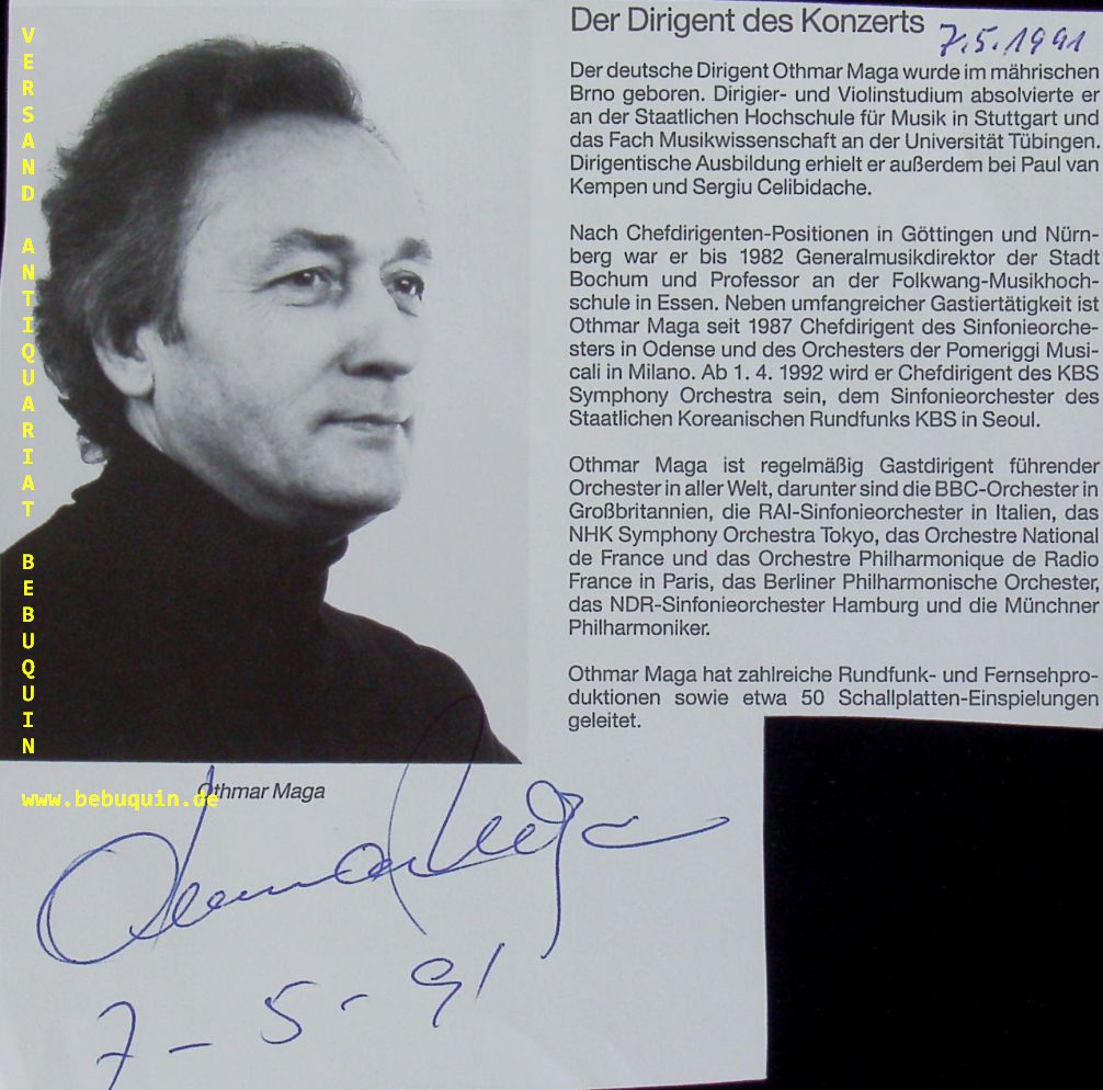 MAGA, Othmar (Dirigent): eigenhändig signierte und datierte Portraitseite. München (Philharmonie), 7.5.1991. 16,5 x 16,5 cm. 1 Bl. Othmar Mága (* 30. Juni 1929 in Brünn, Tschechoslowakei; † 28. Januar 2020 in Kiel) war ein deutscher Dirigent. (Wikipedia)