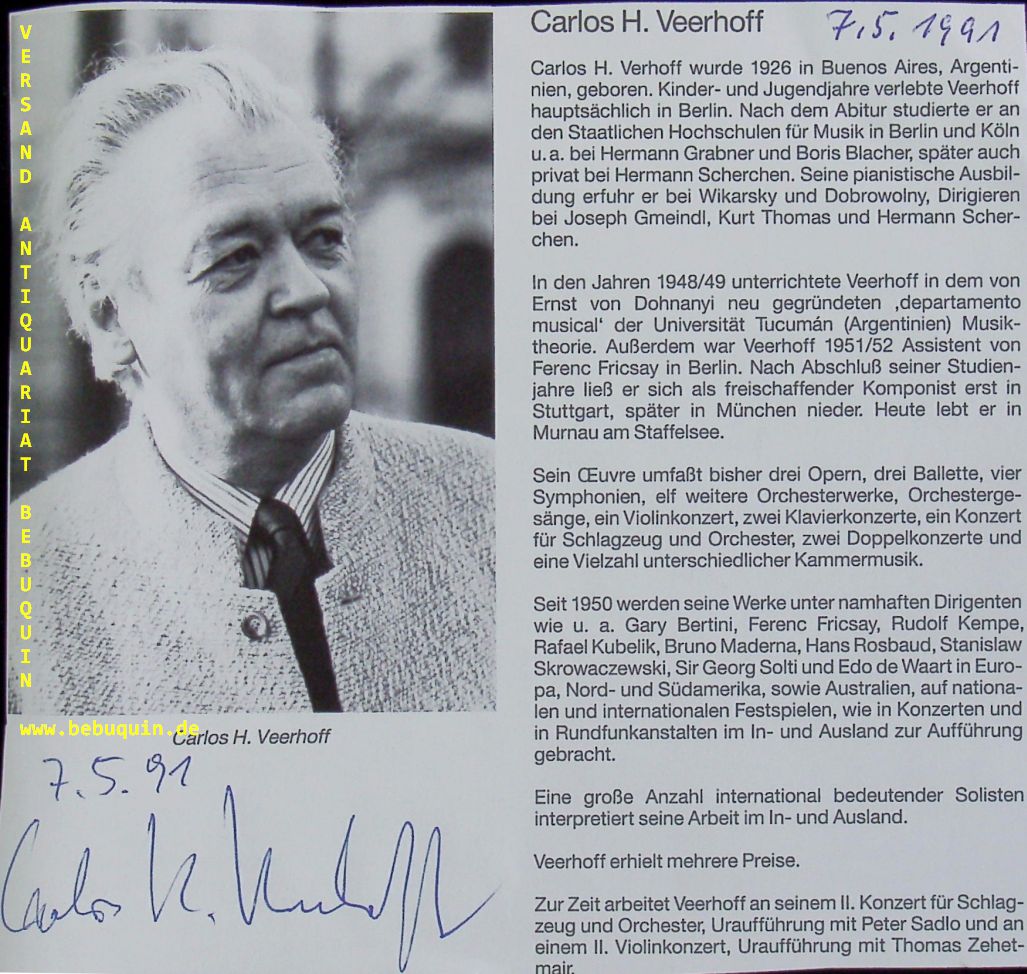 VEERHOFF, Carlos H. (Komponist): eigenhändig signierte und datierte Programmseite. München (Philharmonie), 7.5.1991. 16 x 16,5 cm. 1 Carlos Enrique Veerhoff (* 3. Juni 1926 in Buenos Aires; † 18. Februar 2011 in Murnau am Staffelsee) war ein deutsch-argentinischer Komponist von E-Musik. (Wikipedia)