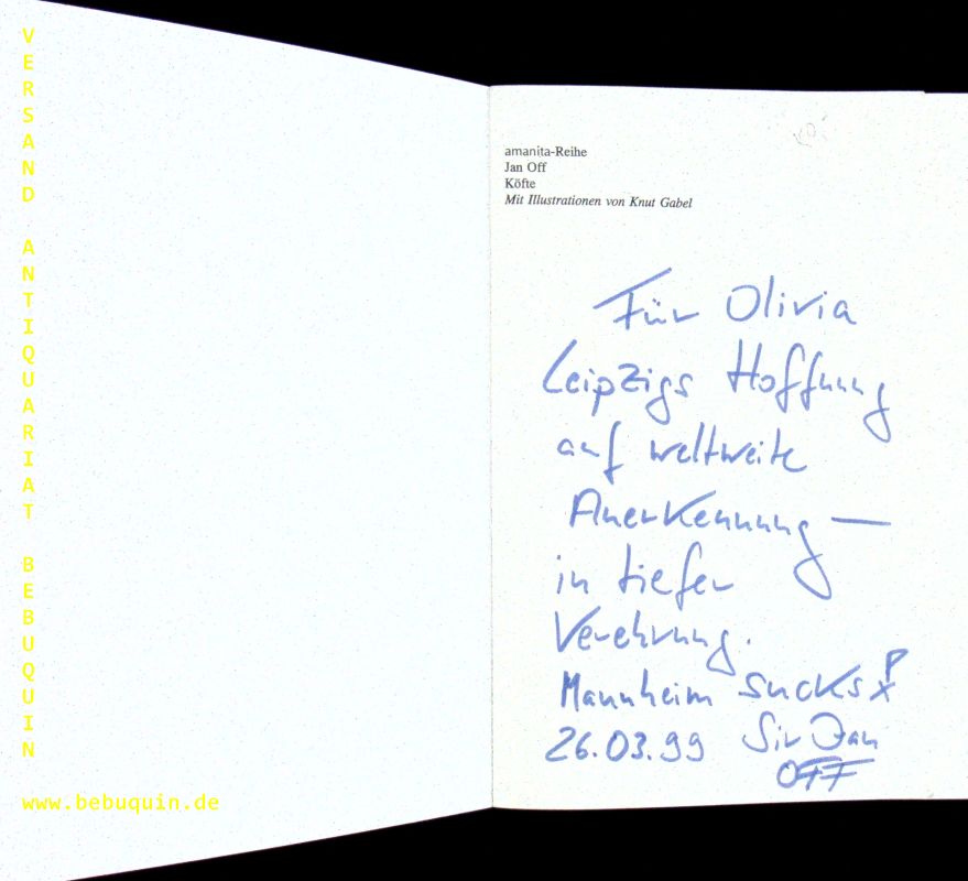 OFF, Jan: Köfte. 2., überarb. Aufl. Mainz (Dreieck), 1999. 85 S. mit Ill. von Knut Gabel. ill. OKart. zahlr. Seiten bekritzelt. = amanita-reihe. Mit einer eigenhändigen 10zeiligen Widmung des Verfassers auf Vorsatz.