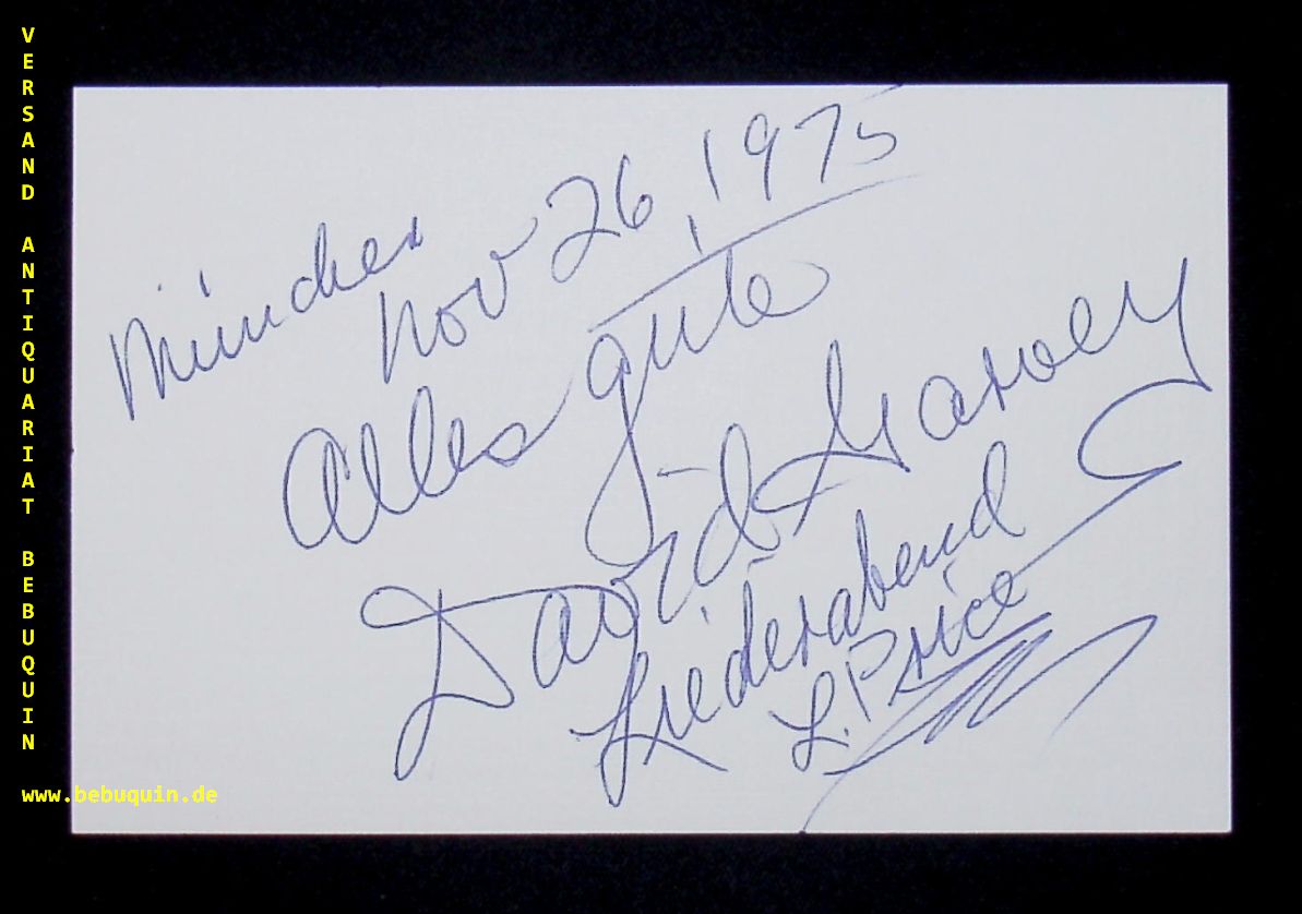 GARVEY, David (Pianist): eigenhändig signierte und datierte Autogrammkarten: Alles Gute. Liederabend L. Price.. München (Philharmonie), 26.11.1975. 8 x 12,5 cm. Karteikarte. David William Garvey (March 13, 1922 – February 14, 1995)[2] was an American pianist and academic. He is known as the regular accompanist of Leontyne Price and other performers, including violinists Itzhak Perlman, Michael Rabin and Wanda Wilkomirska. (Wikipedia)