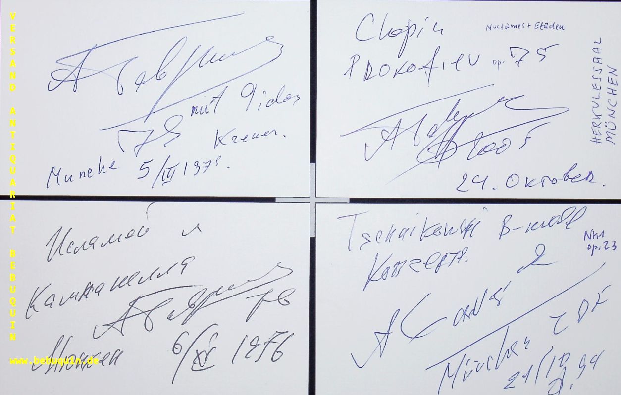 GAVRILOV, Andrei (Pianist): 11 eigenhändig datierte und signierte Autogrammkarten mit eigenhändigen Programmbeschreibungen. München (Philharmonie), 1975 – 2003. 8 x 12,5 cm. 11 Karteikarten.. Andrei Wladimirowitsch Gawrilow (* 21. September 1955 in Moskau) ist ein russischer Pianist. Nach dem Gewinn des Tschaikowski-Wettbewerbs 1974 wurde Gawrilows internationale Karriere zweimal abrupt unterbrochen: 1979 bis 1984 wurde er vom Sowjet-Regime in die Isolation gezwungen, 1993 bis 2001 zog er sich aufgrund einer Lebenskrise vollkommen zurück. Seit 2001 lebt Gawrilow in der Schweiz und setzt dort seine Karriere fort.