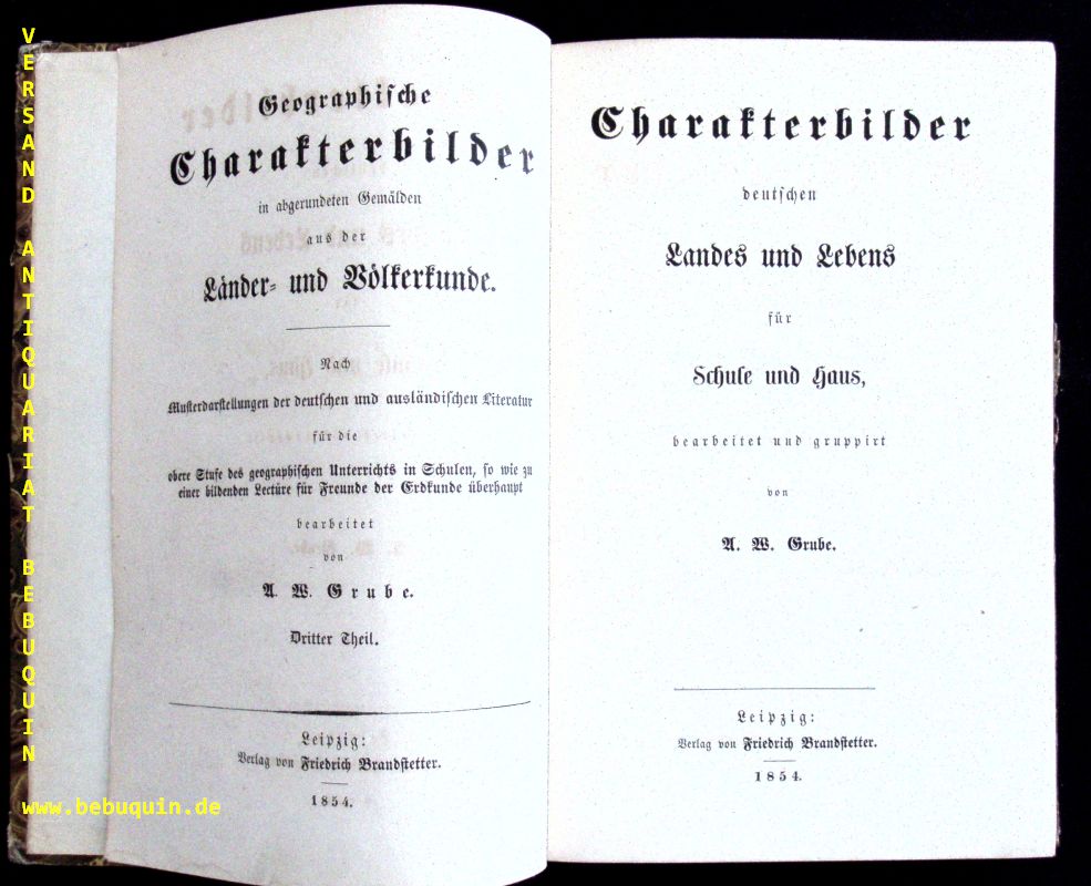 GEOGRAPHIE.– GRUBE, August W.: Charakterbilder deutschen Landes und Lebens für Schule und Haus. Leipzig (Brandstetter), 1854. XVI, 358 S. Pb der Zeit mit goldgeprägtem Rückenschild. = Geographische Charakterbilder in abgerundeten Gemälden aus der Länder- und Völkerkunde. Nach Musterdarstellungen der deutschen und ausländischen Literatur für die obere Stufe des geographischen Unterrichts in Schulen, so wie zu einer bildenden Lectüre für Freunde der Erdkunde überhaupt; Dritter Theil. EA.