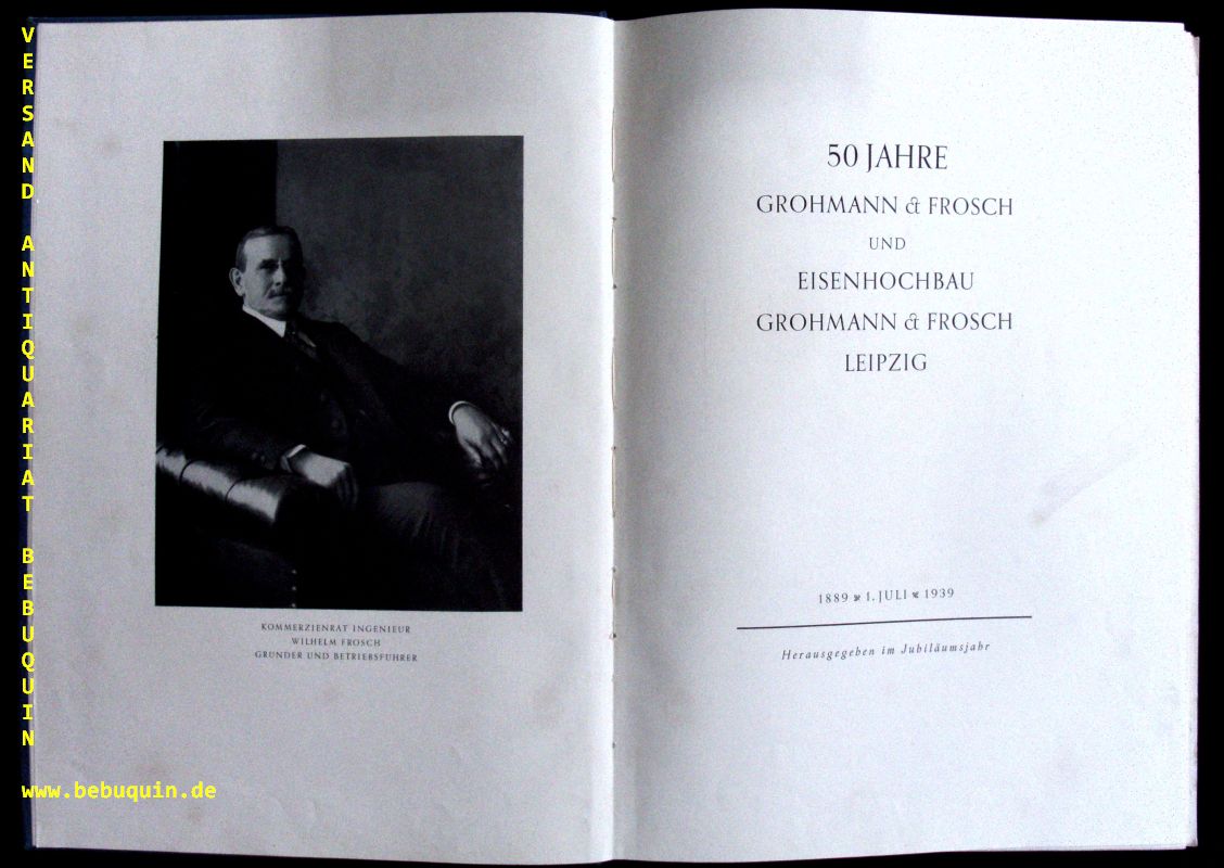 LEIPZIG.– HOCHSTETTER, W: 50 Jahre Grohmann & Frosch und Eisenhochbau Grohmann & Frosch. 1889 – 1939. Leipzig (Spamer), 1939. 141 S. mit zahlr. fotogr. Bildern. OLn mit Goldprägung. etwas gelockert, vereinzelt braufleckig, insgesamt noch gut. seltene EA mit zeitgenössischer Grusskarte inliegend.