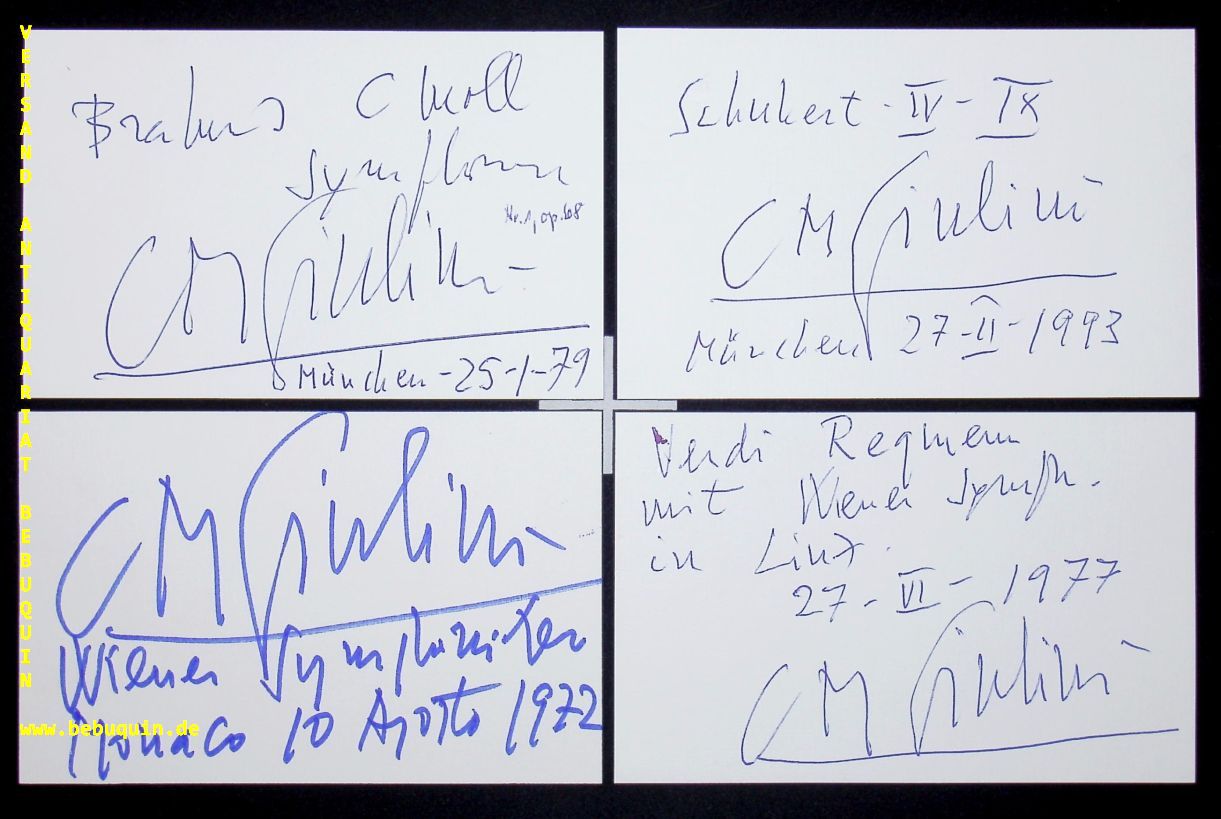 GIULINI, Carlo Maria (Dirigent): 10 eigenhändig signierte und datierte Autogrammkarten mit eigenhändigen Programmbeschreibungen. München (Philharmonie), 1975 – 1996. 8 x 12,5 cm. 10 Karteikarten. Carlo Maria Giulini (* 9. Mai 1914 in Barletta, Provinz Barletta-Andria-Trani; † 14. Juni 2005 in Brescia, Lombardei) war ein italienischer Dirigent. (Wikipedia)