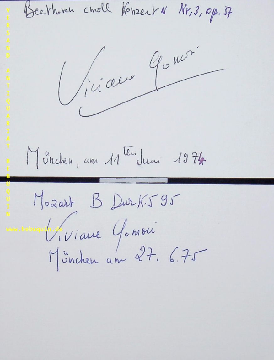 GOMORI, Viviane (Pianistin): 2 eigenhändig signierte und datierte Autogrammkarten. München (Philharmonie), 1974. 8 x 12,5 cm. 2 Karteikarten.