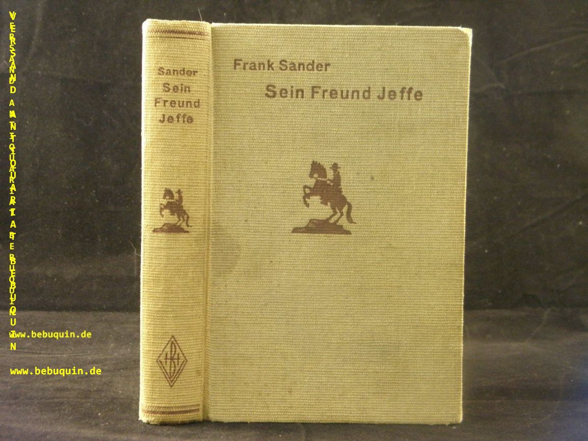 SANDER, Frank: Sein Freund Jeffe. Bremen (Burmester), ca 1935. 224 S. ill. OLn. teils gebräunt und leicht angeschmutzt. = Burmester’s Abenteuer-Serie. EA. Frank Sander hieß in Wirklichkeit Otto Neitsch und war Berliner Senator. Geboren 1892 in Eckernförde, Vater dreier Söhne und gestorben 1941 in Berlin.