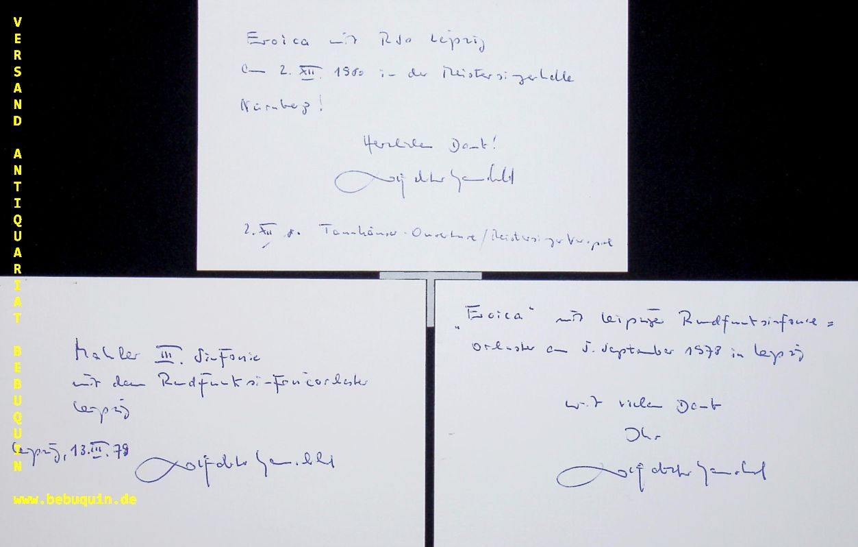 HAUSCHILD, Wolf-Dieter (Dirigent): 3 eigenhändig signierte und datierte Autogrammkarten mit ausführlicher eigenhändiger Programmbeschreibung. München, 1978 – 1980. 8 x 12,5 cm. 3 Karteikarten. Wolf-Dieter Hauschild (* 6. September 1937 in Greiz) ist ein deutscher Dirigent, Chorleiter, Intendant, Komponist, Cembalist und Hochschullehrer.