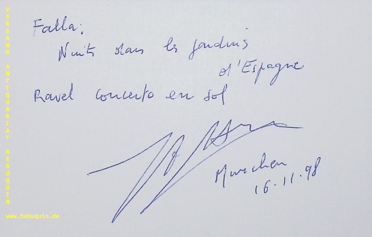 HEISSER, Jean Francois (Pianist): eigenhändig signierte und datierte Autogrammkarte. München, 16.11.1998. 8 x 12,5 cm. Karteikarte. Jean-François Heisser (born 7 December 1950) is a French classical pianist. (Wikipedia)