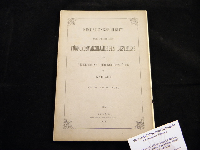 LEIPZIG.– GESELLSCHAFT FÜR GEBURTSHÜLFE ZU LEIPZIG.– Einladungsschrift zur Feier des fünfundzwanzigjährigen Bestehens am 21. April 1879. Leipzig (Engelhardt), 1879. Gr. 8°. 3 Bl., 76 S. mit Textabb. + 2 Faltdiagramme OKart. gutes Ex. sehr seltene EA mit Programm inliegend.