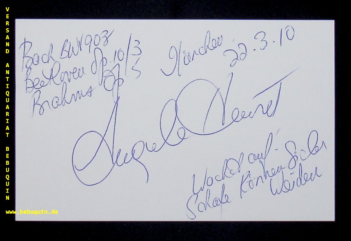 HEWITT, Angela (Pianistin): eigenhändig signierte und datierte Autogrammkarte. München (Herkulessaal), 22.3.2010. 8 x 12,5 cm. Karteikarte.