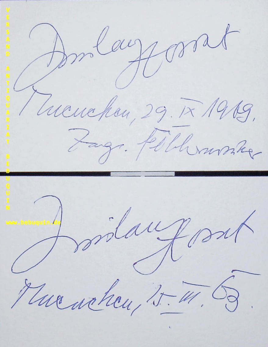 HORVAT, Milan (Dirigent): 2 eigenhändig signierte und datierte Autogrammkarten. München (Herkulessaal), 1963 + 1969. 8 x 12,5 cm. 2 Karteikarten. Milan Horvat (* 28. Juli 1919 in Pakrac, Staat der Slowenen, Kroaten und Serben (heute Kroatien); † 1. Januar 2014 in Innsbruck) war ein kroatisch- bzw. jugoslawisch-österreichischer Dirigent und Dirigierlehrer. Er gehörte zu den bedeutendsten Dirigenten seines Landes und war ein Förderer der zeitgenössischen Musik. Von 1969 bis 1975 wirkte er als Chefdirigent des ORF-Symphonieorchesters in Wien. Ehrendirigate erhielt er von der Zagreber Philharmonie und dem Orchestre de Chambre de Lausanne. (Wikipedia)