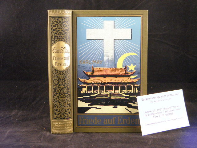 MAY, Karl: Und Friede auf Erden. Reiseerzählung hrsg. von E.A. Schmid und Paul Rentschka. 66.– 72. Tsd. Radebeul (Karl May), (1938). 552 S. farb. ill. OLn. RS2. feines Ex. = Gesammelte Werke, Bd. 30. Absolut rare kriegsvernichtete Ausgabe. „Eine Bestandsaufnahme in Leipzig vom 9.3.1944 – zur Feststellung der Kriegsverluste zusammengestellt – ergab, dass von den Bogen 2 und 23-25 jeweils 3500 Exemplare sowie von den Bogen 14, 15 und 17-19 jeweils 3450 Exemplare vorhanden waren. Alles andere war verbrannt.“ Die Nachdruckgenehmigung wurde 1946 verweigert. Hermesmeier / Schmatz GW 30.11.
