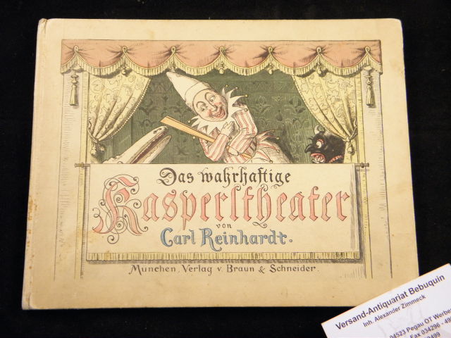 REINHARDT, Carl: Das wahrhaftige Kasperltheater. In sechs Stücken. 14. Aufl. München (Braun & Schneider), ca 1880. Quer Gr. 8°. 52 S. mit handkolorierten Holzschnitten von Carl Reinhardt. farb. ill. OPb. Einband leicht angeschmutzt, innen fingerspurig, insgesamt gut erhalten. Nr. 1: Kasperl als Rekrut in der Türkei. Nr. 2: Don Juan. Nr. 3: Frau Kasperl und die Köchin. Nr. 4: Kasperl und der Teufel. Nr. 5: Das geheimnisvolle Tier. Nr. 6: Kasperl und der Tod. Wegehaupt 2779.
