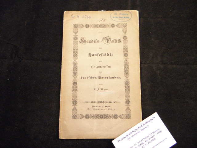 HAMBURG.– WURM, C.F.: Die Handelspolitik der Hansestädte und die Interessen des deutschen Vaterlandes. Hamburg (Tramburgs Erben ), 1839. 32 S. ill. OKart. StaU. seltene EA.