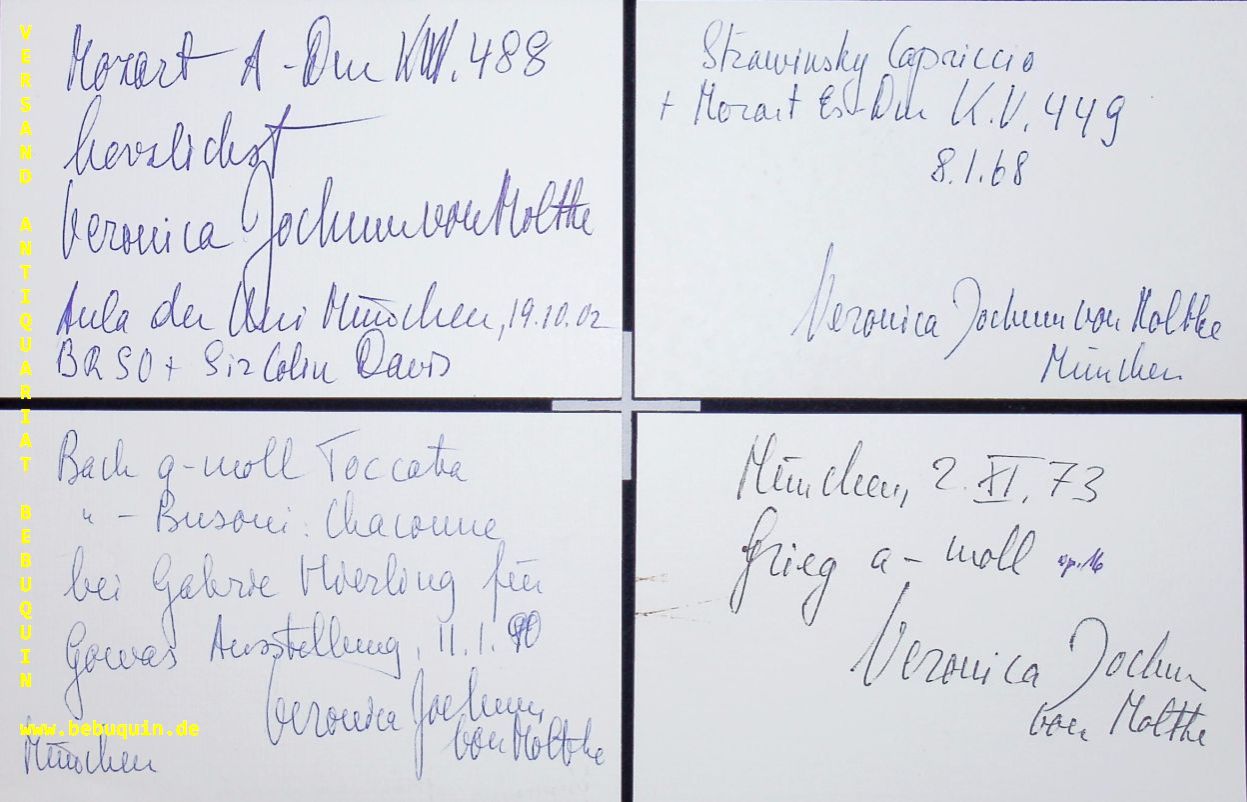 JOCHUM VON MOLTKE, Veronika (Pianistin): 4 eigenhändig signierte und datierte Autogrammkarten. München (Herkulessaal), 1968 + 2002. 8 x 12,5 cm. 4 Karteikarten.
