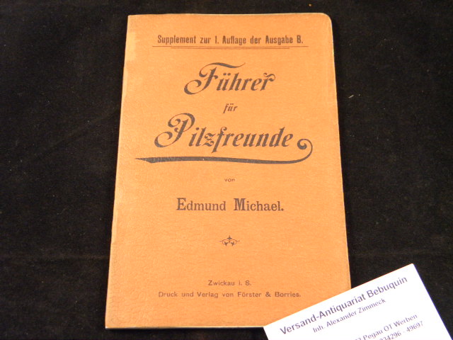 PILZE.– MICHAEL, Edmund: Supplement zur 1. Auflage der Ausgabe B. Führer für Pilzfreunde. Zwickau (Förster & Borries), 1896. Farbtafeln mit 21 nach der Natur gemalten Pilzgruppen von Albin Schmalfuß sowie deren Beschreibung. ill. OKart. gutes Ex. EA. Edmund Michael war Oberlehrer an der Landwirtschaftsschule zu Auerbach. Im 1895 erschien erstmals sein Führer für Pilzfreunde mit Abbildungen des Kunstmalers Albin Schmalfuß aus Leipzig, der ihn als Pilzvater bekannt machte.