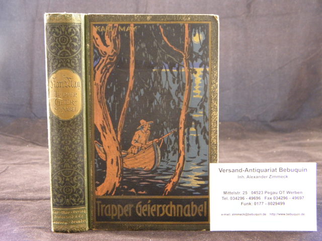 MAY, Karl: Trapper Geierschnabel. 1.– 25. Tsd. Hrsg. von E.A. Schmid und Franz Kandolf. Radebeul (Karl May), (1925). 509 (3) S. mit 1 Frontispiz. ill. OHLn. Farbstarker Einband mit goldenem Rücken, schief gelesen, Papier altersbedingt gebräunt, hinterer Vorsatz fehlt, dort auch im Gelenk gelockert. = Gesammelte Werke, Bd. 54. „In den nachfolgenden Auflagen wurden verschiedene Szenen durch Kürzungen entschärft. Es wurden fast 12 Seiten herausgestrichen.“ Hier also noch der unverfälschte Text. Hermesmeier / Schmalz GW 54.1.