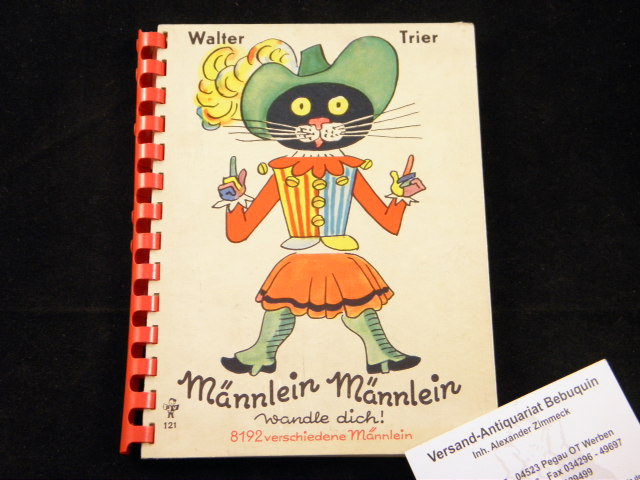 TRIER, Walter. Männlein Männlein wandle dich! 8192 verschiedene Männlein. München (Pestalozzi), (1953). kl. 8°. 32 dreigeteilte Seiten mit farbigen Bildern von Walter Trier. farb. ill. OPb mit Spiralbildung. feines Ex. Erste deutsche Ausgabe des 1949 erstmals im Atrium Press Verlag in London erschienenen Klappbilderbuchs mit neuer Einbandzeichnung und unterschiedlichen Bildkombinationen. – Hatry 24.2. – Seeber-D.
