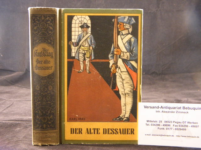 MAY, Karl: Der alte Dessauer. Humoresken. Hrsg. von E.A. Schmid. 56.– 65. Tsd. Radebeul (Karl May), (1941). 588 (3) S. mit einer Kartenskizze. farb. ill. OHLn. von Selecta-Druck GmbH Dresden (DB 155). Deckel mit kleinem Kratzer, Schnitt leicht angeschmutzt, leuchtendes Rückengold, gutes Ex. = Gesammelte Werke, Bd. 42. Hermesmeier / Schmatz GW 42.6. der letzten Auflage, die nach Kriegsende nach jahrelangem Bemühen des KMV als Rohtext nachgebunden werden konnte.