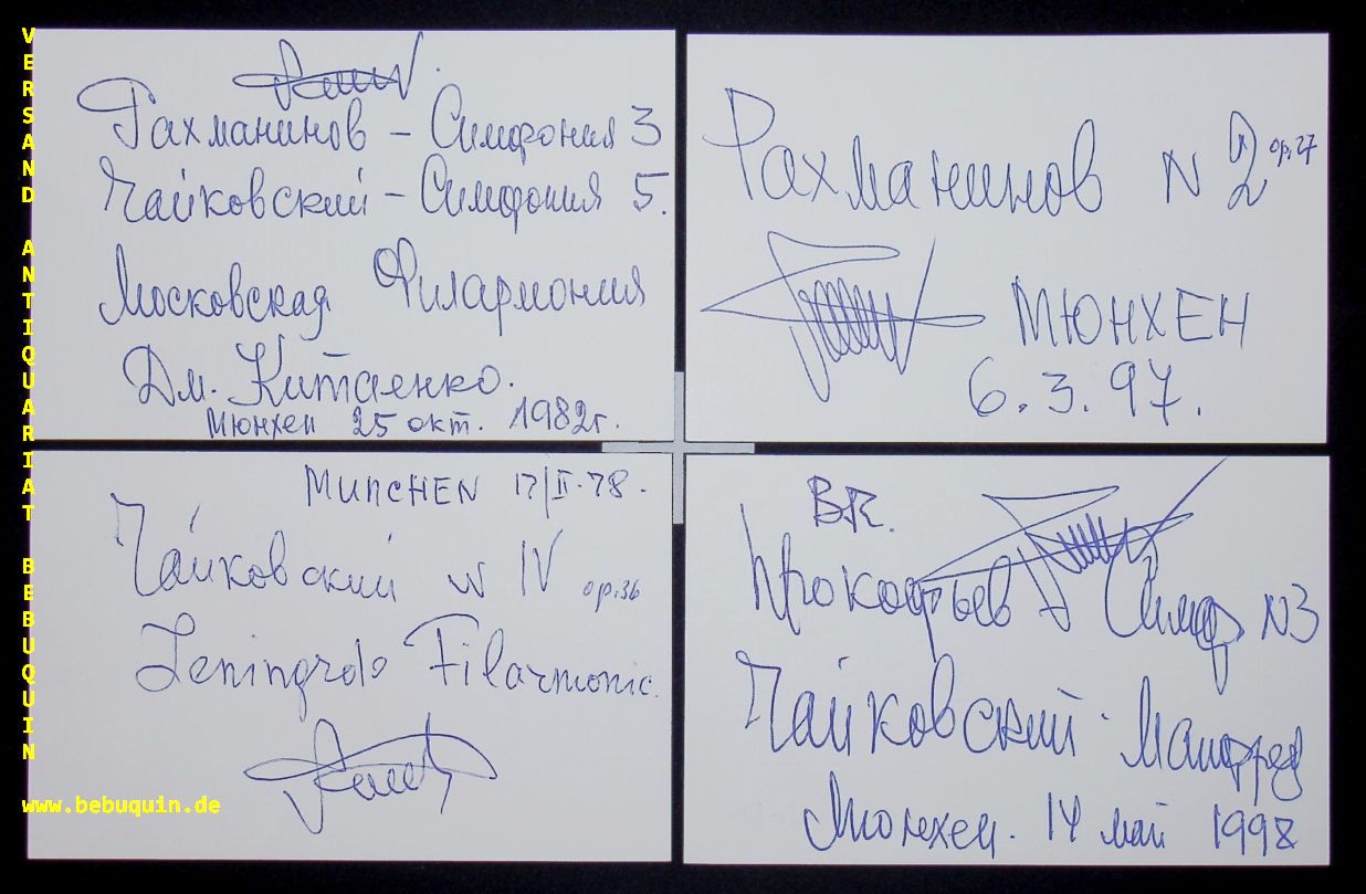 KITAJENKO, Dmitrij (Dirigent): 9 eigenhändig signierte und datierte Autogrammkarten mit teils ausführlichen Programmbeschreibungen. München (Philharmonie), 1977 – 1997. 8 x 12,5 cm. 8 Karteikarten. Dmitri Georgijewitsch Kitajenko (* 18. August 1940 in Leningrad (heute Sankt Petersburg), Sowjetunion) ist ein russischer Dirigent.