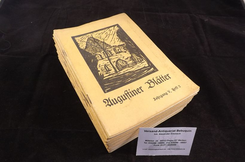 GRIMMA.– FRAUSTADT, Georg: (Hrsg.) Augustiner Blätter. Fast komplette Folge von 34 Heften der Schulzeitung.. Grimma (Bode), 1928 – 1939. ca 600 S. ill. OKart. etwas bestaubt, ein kleiner Randeinrss. Umfangreiche Sammlumng mit historischer Relevanz. Vorhanden sind die folgenden Nummern: Jg. V, Heft 2 + 3; Jg. VI, Heft 1 – 4; Jg. VII, Heft 1 – 4; Jg. VIII, Heft 1 – 4; JG. IX, Heft 1 – 4; Jg. X, Heft 1, 3 + 4; JG IX, Heft 1 – 3; Jg. XII, Heft 1 – 3; Jg. XIII, Heft 1 – 3; Jg. XIV, Heft 1 – 3; Jg. XV, Heft 1 + 3; Jg. XVI, Heft 1. Ein sehr aufschlussreiches Zeitdokument.