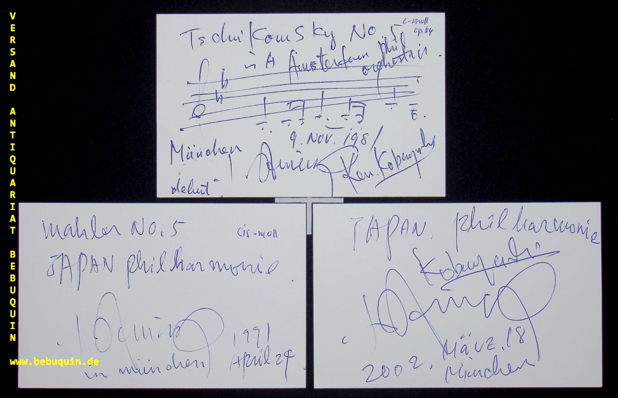KOBAYASHI, Ken-Ishiro (Dirigent): 3 eigenhändig signierte und datierte Autogrammkarten mit Notenzitat zum München Debut. München, 1981 – 2002. 8 x 12,5 cm. 3 Karteikarten. Ken’ichiro Kobayashi (born 9 April 1940) is a Japanese conductor and composer. (Wikipedia)