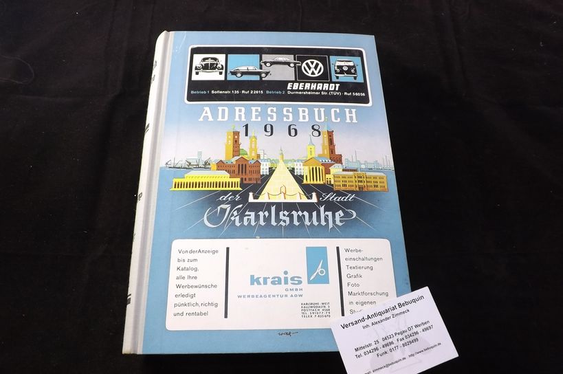 KARLSRUHE.– ADRESSBUCH DER STADT KARLSRUHE 1968.– 91. Jahrgang. Karlsruhe (G. Braun), April 1967. 4°. 92, 36, 582, 389, 92 S. ill. OHLn. Kanten leicht bestoßen, sonst tadellos erhalten. Enthält Namen- und Firmenteil, Straßen- und Häuserteil, Branchen- und Warenteil.