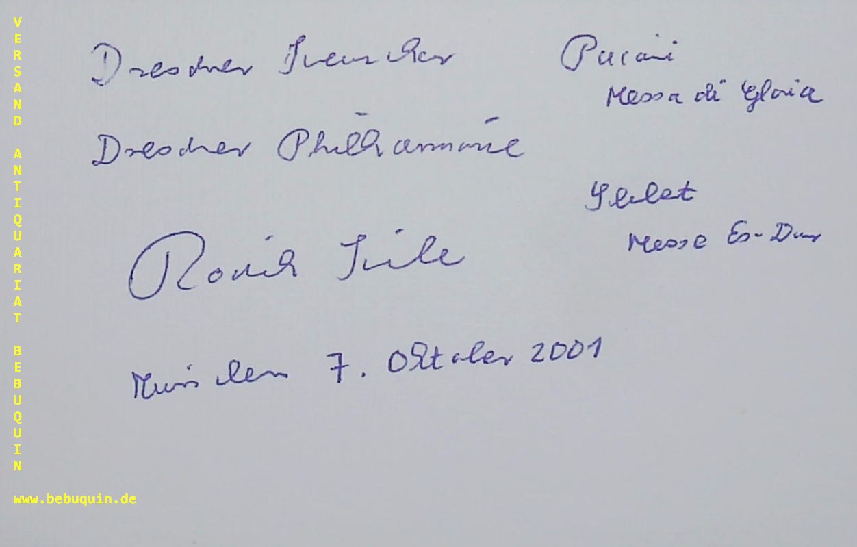 KREILE, Roderich (Dirigent): eigenhändig signierte und datierte Autogrammkarte. München (Philharmonie), 7.10.2001. 8 x 12,5 cm. Karteikarte. Roderich Kreile (* 17. Dezember 1956 in München) ist ein evangelischer Kirchenmusiker, Chorleiter und Hochschullehrer. Als 28. evangelischer Kreuzkantor leitet er seit 1997 den Dresdner Kreuzchor. (Wikipedia)
