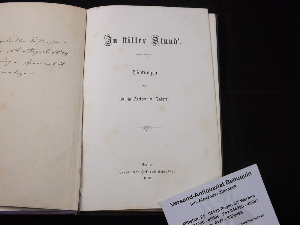 DYHERRN, George Freiherr von: In stiller Stund’. Dichtungen. Berlin (Schindler), 1870. X, 167 S. OLn. mit üppiger Deckel-Goldprägung. Kapitale leicht angeplatzt, WaV.