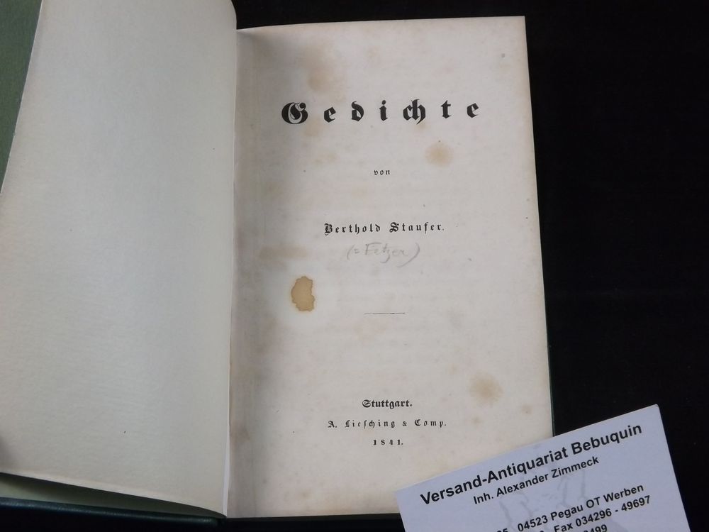 STAUFER, Berthold: (d.i. C.A. Fetzer) Gedichte. Stuttgart (Liesching), 1841. kl. 8°. X, 334 S. späteres Ldr. mit goldgeprägtem Rückenschild. ein Blatt in verkehrter Reihenfolge eingebunden. EA des Stuttgarter Rechtsanwalts und Abgeordneten. Krauß II, 199.