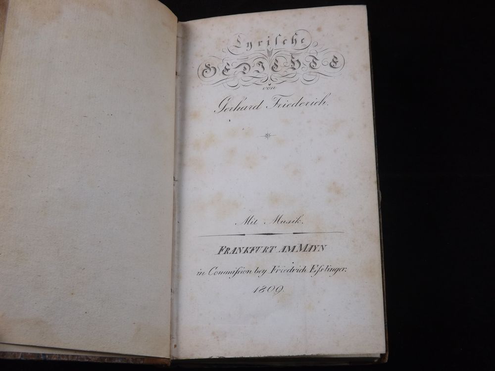 FRIEDERICH, Gerhard: Lyrische Gedichte. Mit Musik. Frankfurt (Esslinger), 1809. kl. 8°. 10 Bl., 194 S. + 3 gefaltete Musikbeilagen. HLdr. der Zeit mit goldgeprägtem Rücken. feines Ex. EA des Erstlingswerks des Frankfurter Pfarrers, der später auch unter dem Pseudonym Friedrich Waller erfolgreich war.