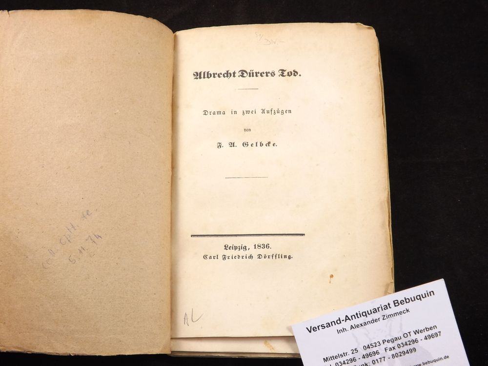 GELBCKE, Ferdinand A.: Albrecht Dürers Tod. Drama in zwei Aufzügen. Leipzig (Dörffling), 1836. 112 S., 2 Bl. Kart. der Zeit. Kanten unbeschnitten. EA des Erstlings Kosch VI, 173.