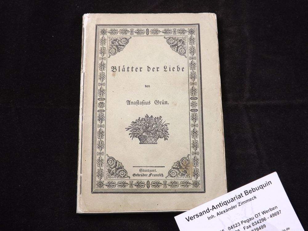 GRÜN, Anastasius: (d. i. Graf Auersberg) Blätter der Liebe. Stuttgart (Franckh), 1830. kl. 8°. 126 (2) S. ill. OBr. EA des Erstlings WG² 1.