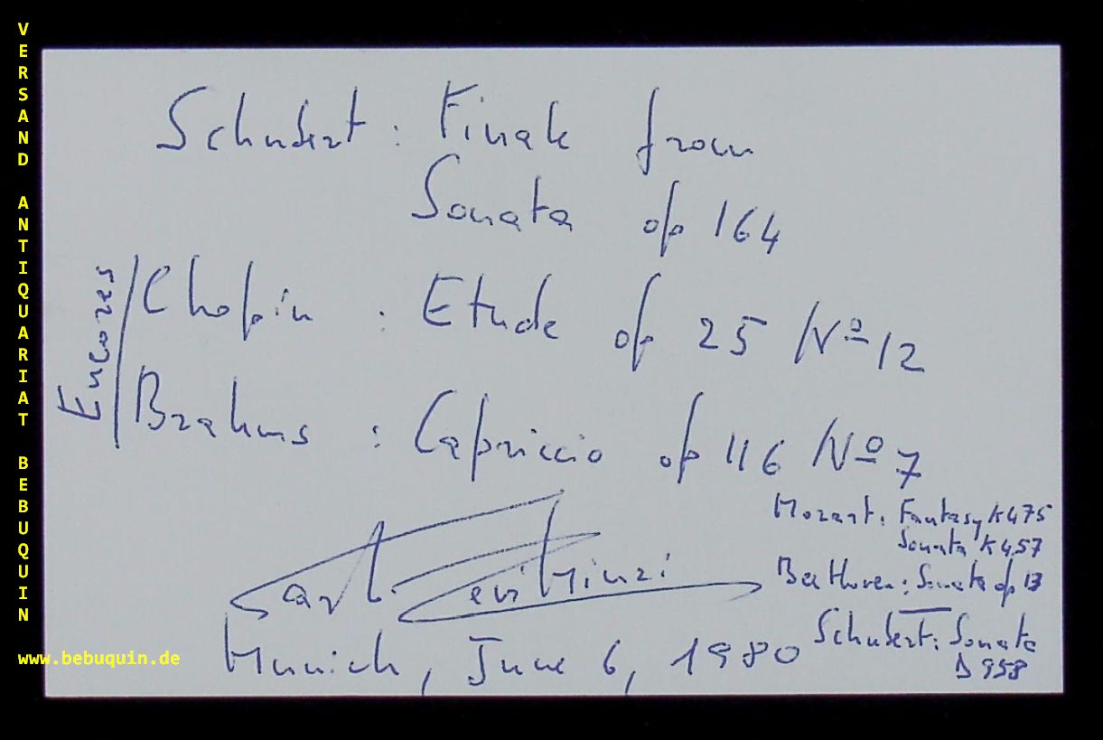 LEVI-MINZI, Carlo (Pianist): eigenhändig signierte und datierte Autogrammkarte. München (Herkulessaal), 6.6.1980. 8 x 12,5 cm. Karteikarte. Carlo Levi Minzi studierte bei Enrica Cavallo, Vladimir Natanson, Paul Baumgartner und Mieczyslaw Horszowski. Konzerte führten ihn in vielen großen europäischen und amerikanischen Musikmetropolen. Rundfunk-, Fernsehaufnahmen und CD- Produktionen spiegeln sein breites pianistisches Spektrum wider. Sein Repertoire, das von Bach bis zur zeitgenössischen Literatur reicht, umfasst sämtliche Sonaten von Mozart, Beethoven, Schubert und Skrjabin und mehr als 50 Konzerte für Klavier und Orchester. Carlo Levi Minzi ist ordentlicher Professor am Conservatorio “G. Verdi” Mailand. Zudem ist er häufig “Visiting Professor” exklusiver musikalischer Stiftungen. (Selbstportrait)