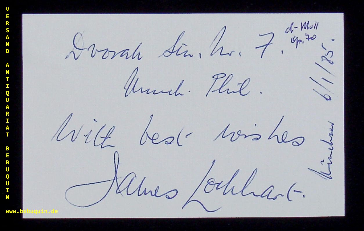 LOCKHART, James (Dirigent): eigenhändig signierte und datierte Autogrammkarte: With best wishes. München (Philharmonie), 6.1.1985. 8 x 12,5 cm. Karteikarten. James Lockhart (born 16 October 1930) is a Scottish conductor, pianist and organist who served as music director for a number of organisations. (Wikipedia)