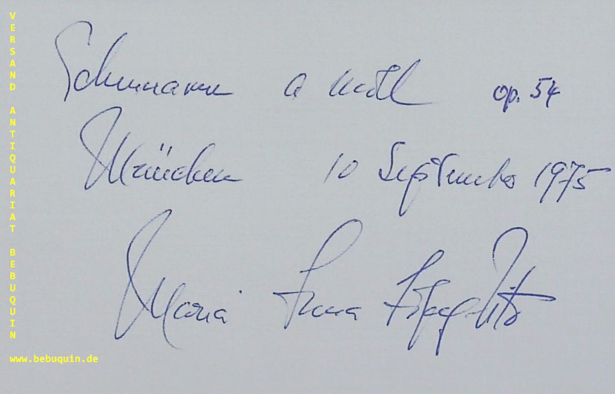 LOPEZ-VITO, Maria Luisa (Pianistin): eigenhändig signierte und datierte Autogrammkarte. München (Herkulessaal), 10.9.1975. 8 x 12,5 cm. Karteikarte. María Luisa López-Vito (* 10. August 1939 in Iloilo/Philippinen) ist eine philippinisch-deutsche Pianistin. (Wikipedia)