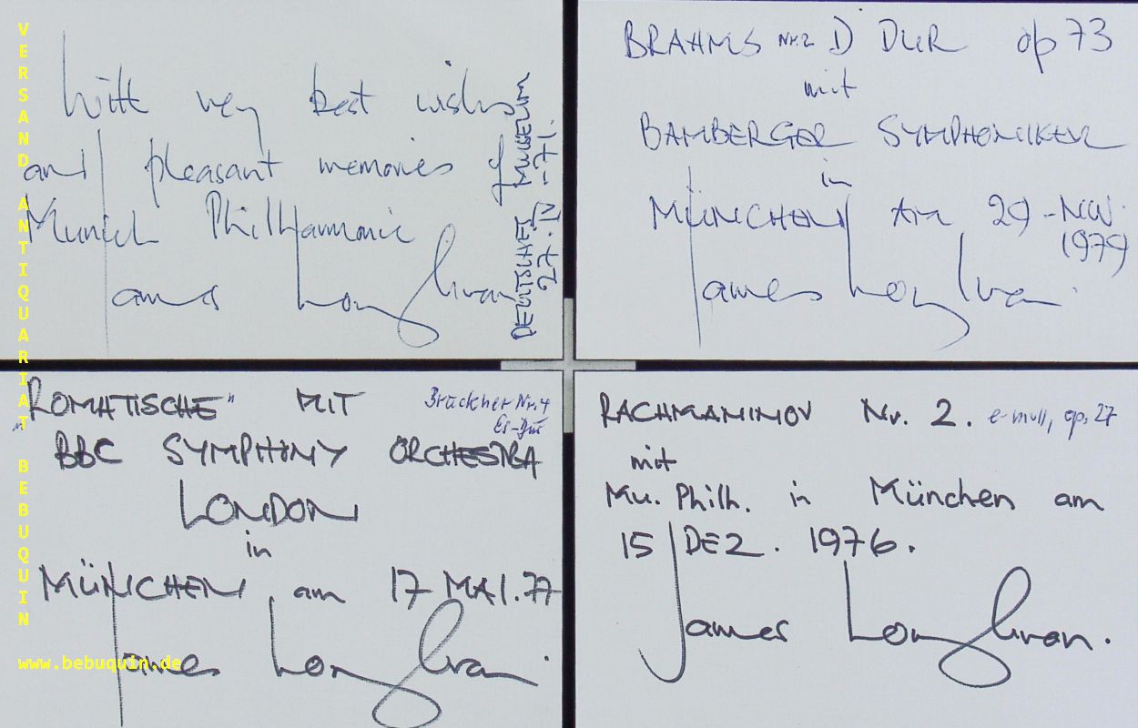 LOUGHRAN, James (Dirigent): 8 eigenhändig signierte und datierte Autogrammkarten mit teils persönlichen Grüßen. München (Philharmonie), 1971 – 1979. 8 x 12,5 cm. 8 Karteikarten. James Loughran (born 30 June 1931, Glasgow, Scotland) is a conductor. (Wikipedia)