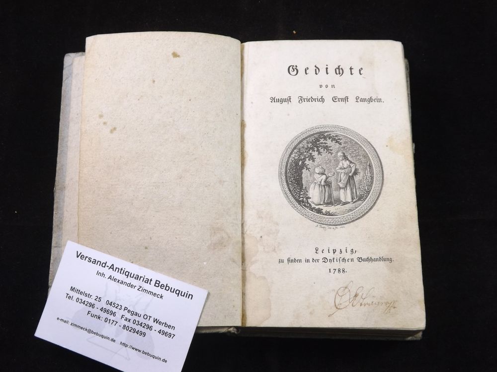 LANGBEIN, August Friedrich Ernst: Gedichte. Leipzig (Dyk), 1788. 1 Bl., XXII, 346 S. mit gestochener Titelvignette + 2 Kupfertafeln von J. Penzel. Pb. der Zeit mit Lederrückenschild. hinterer Vorsatz mit Marginalien der Zeit. EA des Erstlingswerks WG² 1. August Friedrich Ernst Langbein (* 6. September 1757 in Radeberg; † 2. Januar 1835 in Berlin) war ein deutscher Dichter und Romanschriftsteller.