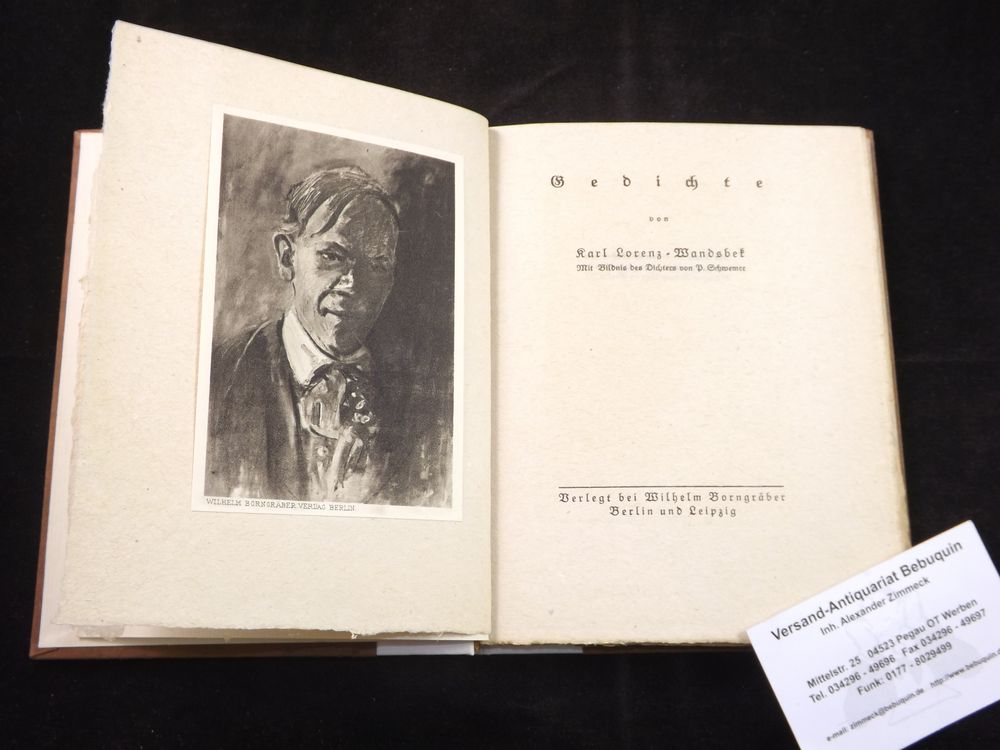 LORENZ-WANDSBEK, Karl: Gedichte. Berlin (Borngräber), 1914. 63 (1) S. auf Maschinenbütten mit Bildnis des Dichters von P. Schwemer. OPb. mit goldgeprägtem Rücken. NaV, schönes Ex. sehr seltene EA der 3. Veröffenlichung des expressionistischen Dichters, Malers und Graphikers. Raabe 195.3.