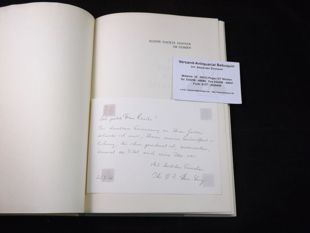 MEIER-LENZ, Dieter Paul: Kleine nackte Männer im Gehirn. Kurzgeschichten. Hamburg (Appel), 1968. Gr. 8°. 60 S., 2 Bl. OPb. mit OUmschl. EA des Erstlings mit aufgeklebtem, eigenhändigen, signierten und datierten Brief des Verfassers an die Ehefrau des im Buch genannten Widmungsadressaten.