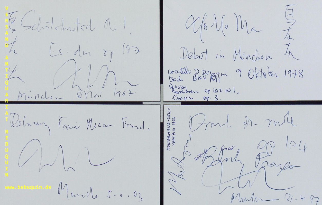 YO YO MA (Cellist): 5 eigenhändig signierte und datierte Portraitseite. München (Herkulessaal), 1978 – 2003. 8 x 12,5 cm. 5 Karteikarten.