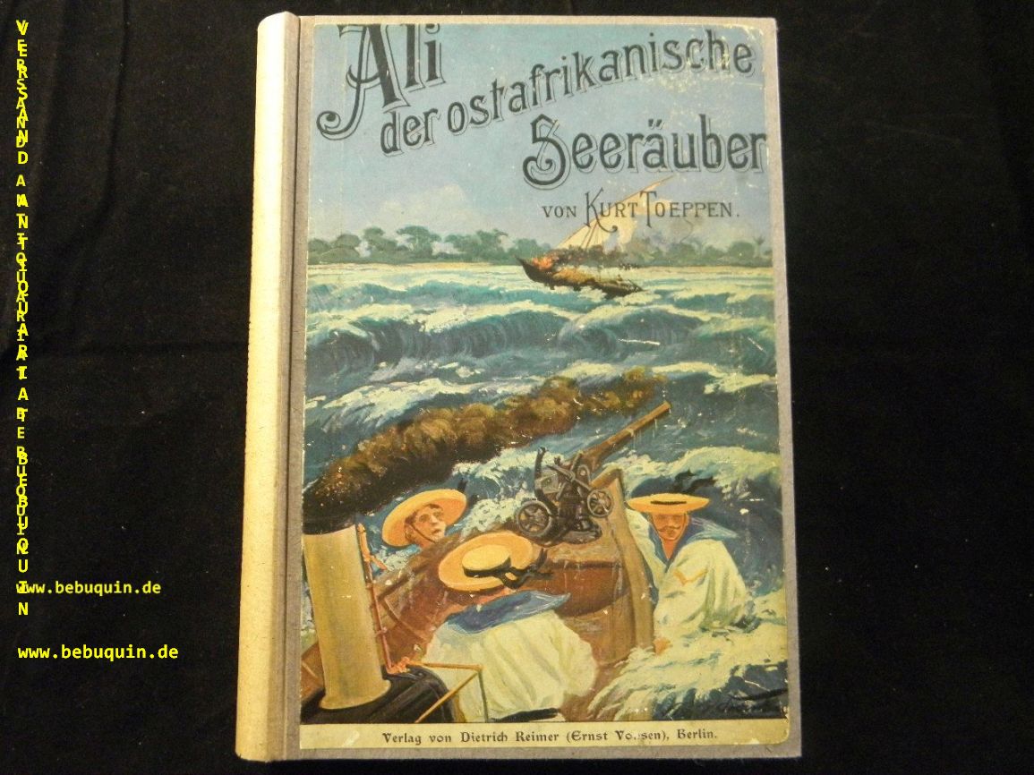 TOEPPEN, Kurt: Ali der ostafrikanische Seräuber. Erzählungen aus dem Seeräuberleben der Lamu-Leute Ende der achtziger Jahre. Berlin (Reimer), 1903. Gr. 8°. V, 288 S. mit 4 Farbendruck-, 6 Autotypie-Vollbilder und zahlr. Textabb. neuer Pb unter Verwendung des Original Einbandes. fein restauriertes Ex. seltene EA. nicht bei Klotz.