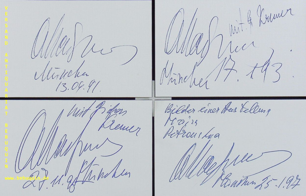 MAISENBERG, Oleg (Pianist): 8 eigenhändigen signierte und datierte Autogrammkarten mit teils ausführlichen eigenhändigen Programmbeschreibungen. München (Herkulessaal), 1975 – 1996. 8 x 12,5 cm. 8 Karteikarten. Oleg Iossifowitsch Maisenberg (* 29. April 1945 in Odessa) ist ein russischer Pianist und Professor an der Universität für Musik und darstellende Kunst in Wien. (Wikipedia)