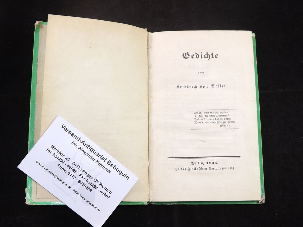 SALLET, Friedrich von: Gedichte. Berlin (Finkesche), 1835. kl. 8°. IV, 137 (1), sowie ein Anhang mit 9 S. handschriftlicher Gedichte. Pb. der Zeit. EA des Erstllingswerks des 23-jährigen Lyrikers WG² 1.