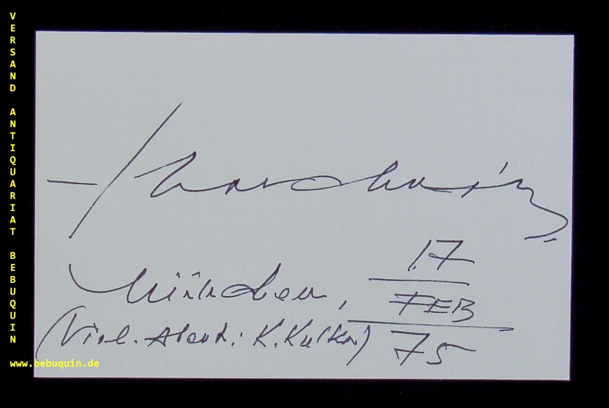 MARCHWINSKI, Jerzy (Pianist): eigenhändig signierte und datierte Autogrammkarte. München (Philharmonie), 17.2.1975. 8 x 12,5 cm. Karteikarte. Jerzy Marchwinski (* 6. Januar 1935 in Truskolasy) ist ein polnischer Pianist und Musikpädagoge. (Wikipedia)