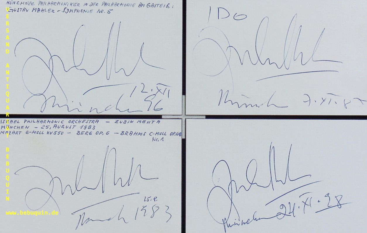 MEHTA, Zubin (Dirigent): 9 eigenhändig signierte und datierte Autogrammkarten. München (Philharmonie), 1975 – 2001. 8 x 12,5 cm. 9 Karteikarten. Zubin Mehta (* 29. April 1936 in Bombay, heute Mumbai) ist ein indischer Dirigent. Der vielseitig und international tätige Künstler war u. a. von 1962 bis 1978 Chefdirigent der Los Angeles Philharmonic, von 1978 bis 1991 Chefdirigent der New Yorker Philharmoniker, von 1998 bis 2006 Generalmusikdirektor der Bayerischen Staatsoper. Von 1977 bis 2019 war er zudem Musikdirektor des Israel Philharmonic Orchestra. (Wikipedia)